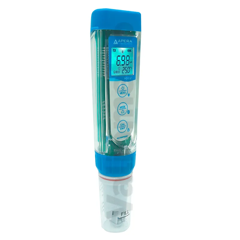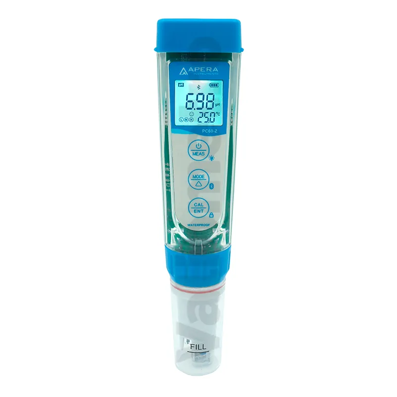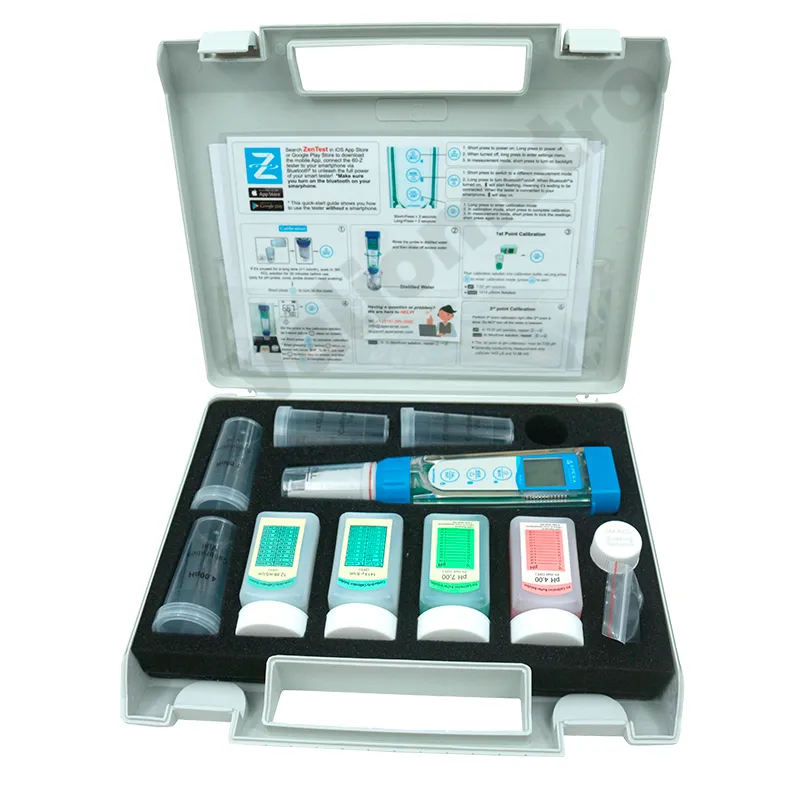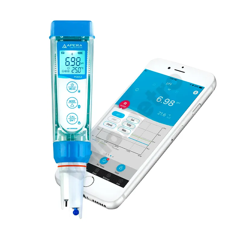 El Kit de probador de bolsillo inteligente multiparámetro ZenTest® PC60-Z es un medidor portátil de alta precisión diseñado para el análisis rápido de pH, conductividad (EC), TDS, salinidad y temperatura en una sola herramienta. Su tecnología digital avanzada y la conectividad con la aplicación ZenTest® permiten registrar, almacenar y gestionar los datos de manera eficiente desde un dispositivo móvil. El PC60-Z cuenta con sensor reemplazable, pantalla LCD retroiluminada y calibración automática de múltiples puntos, lo que garantiza mediciones confiables en laboratorio, campo o industria. Es ideal para aplicaciones en tratamiento de agua, acuicultura, hidroponía, alimentos y bebidas, asegurando control de calidad y facilidad de uso en todo momento.