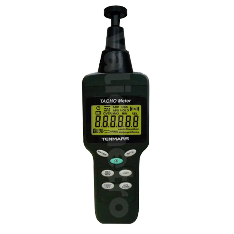 El TM-4100 es un tacómetro digital de alta precisión diseñado para medir la velocidad de rotación (RPM) mediante tecnología láser sin contacto. Solo requiere apuntar el haz hacia la superficie con la cinta reflectiva para obtener lecturas rápidas, estables y seguras, incluso a distancias considerables.