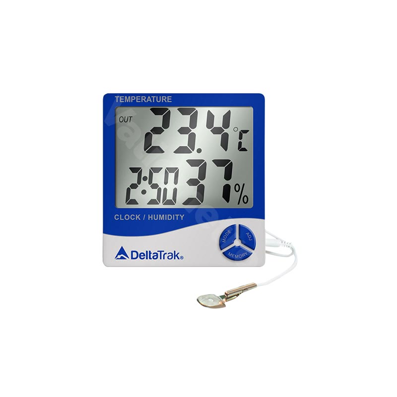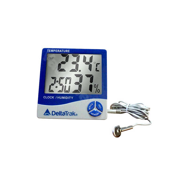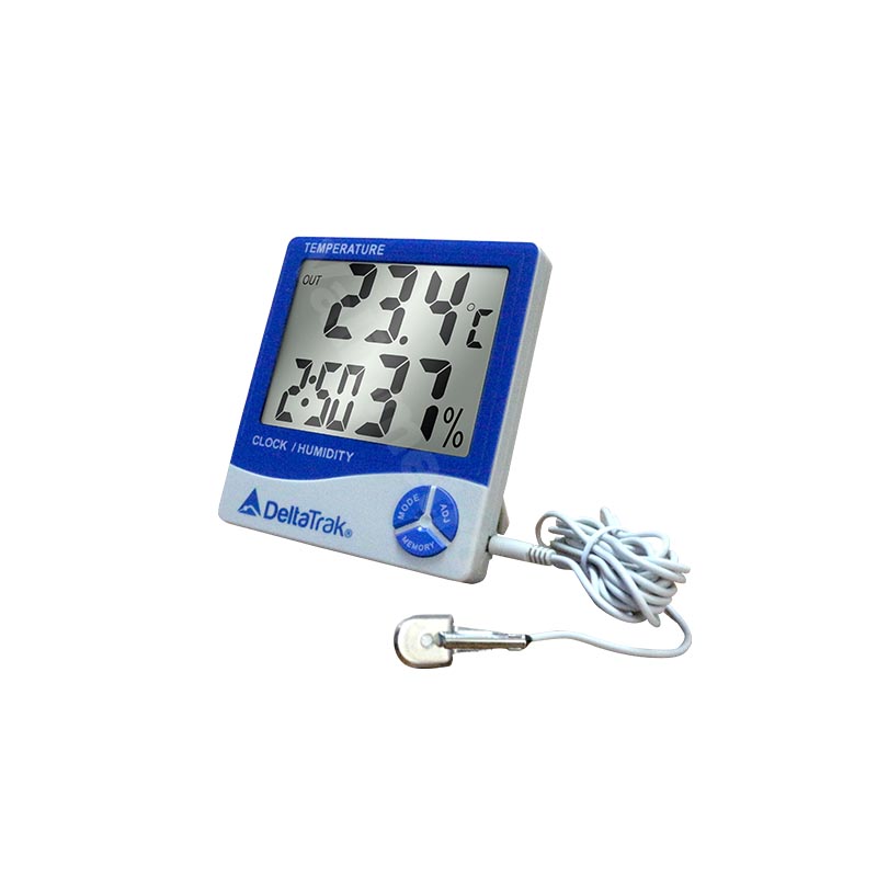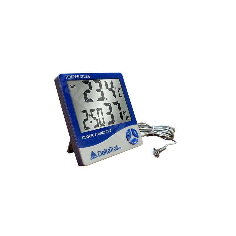 El termohigrómetro con pantalla gigante, modelo 13309, monitorea la temperatura y la humedad relativa en áreas de almacenamiento y producción, cámaras frigoríficas, hospitales, farmacias, bancos de sangre, salas limpias, invernaderos, producción de animales vivos, como gallineros y criaderos. Este termohigrómetro cuenta con una gran pantalla LCD, se puede cambiar entre °F/°C, almacena y recupera lecturas mínimas/máximas, tiene una opción para configurar alarmas diarias y por hora. El sensor de termistor externo con un cable de extensión cuenta con un soporte de sonda para una colocación segura.